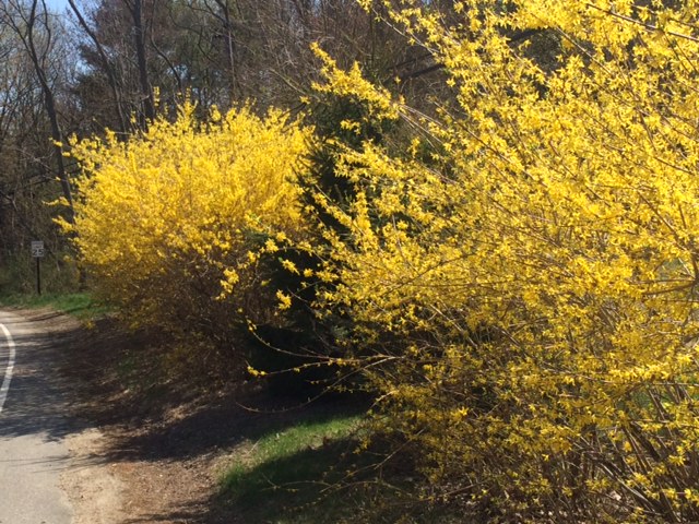 Second, I stopped along the road in York and asked a woman painting on a lawn ‘How will we live tomorrow?’ Marcye Newton responded, and invited me to visit the York Art Association, where they had a great show of Art in Bloom in honor of spring. Marcye’s thick, brilliant flowers resonated with me. They were almost as bright as the forsythia that is abundant, unruly, and at peak color as I move north.