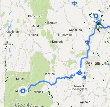 The first third of my route was a beautiful ride along US Route 5 through the Connecticut River Valley. I passed large farms, rocky waterfalls, and travelled through many lovely towns. Windsor is particularly charming, and was the place where Vermont’s Constitution was signed. I never knew that Vermont was an independent country from 1777 until it joined the union as the fourteenth state in 1791.