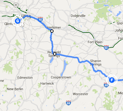 At Richfield Springs I turned off U.S 20 to NY 28 then County Road 150. The turns didn’t lay quite right, but I was confident of my sense of direction and kept on. It was one o’clock now, the sun was straight overhead, and I lost my cardinal sense. When I came upon an intersection that included roads I had already left, I stopped to study my GPS. A couple sitting on their porch offered guidance. I took off on a new tack.
