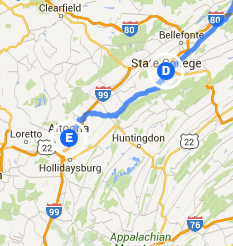 I got on the road before eight for a sweet ride to Altoona. Even on short days, clocking miles in the morning is always best. For the first ten miles I had plenty of company; there were more cyclists and runners in health-conscious State College than vehicles on this postcard perfect holiday morning. The next ten miles took me through beautiful rolling countryside and into the village of Spruce Creek, where I enjoyed a breakfast break along a shady spot on the road overlooking the Juanita River while fly fishermen in waders stood silently flipping their lines into the stream.