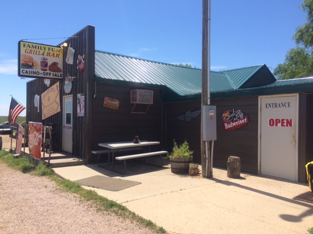It was 10:30 before I began my short ride to Buffalo, South Dakota. Even the wind took a rest day. Sixteen miles in I crossed the state line and the topography changed. No more farms, just grazing land and buttes without a spec of shade. Riding was easy and I was happy to find Suzette’s Crooked Creek Bar along the road in Ludlow. Suzette is the owner and bar mistress, her husband runs the grille, and she has all cyclists sign her counter, in exchange for free pop. I stayed an hour because Suzette and her place were tons of fun.