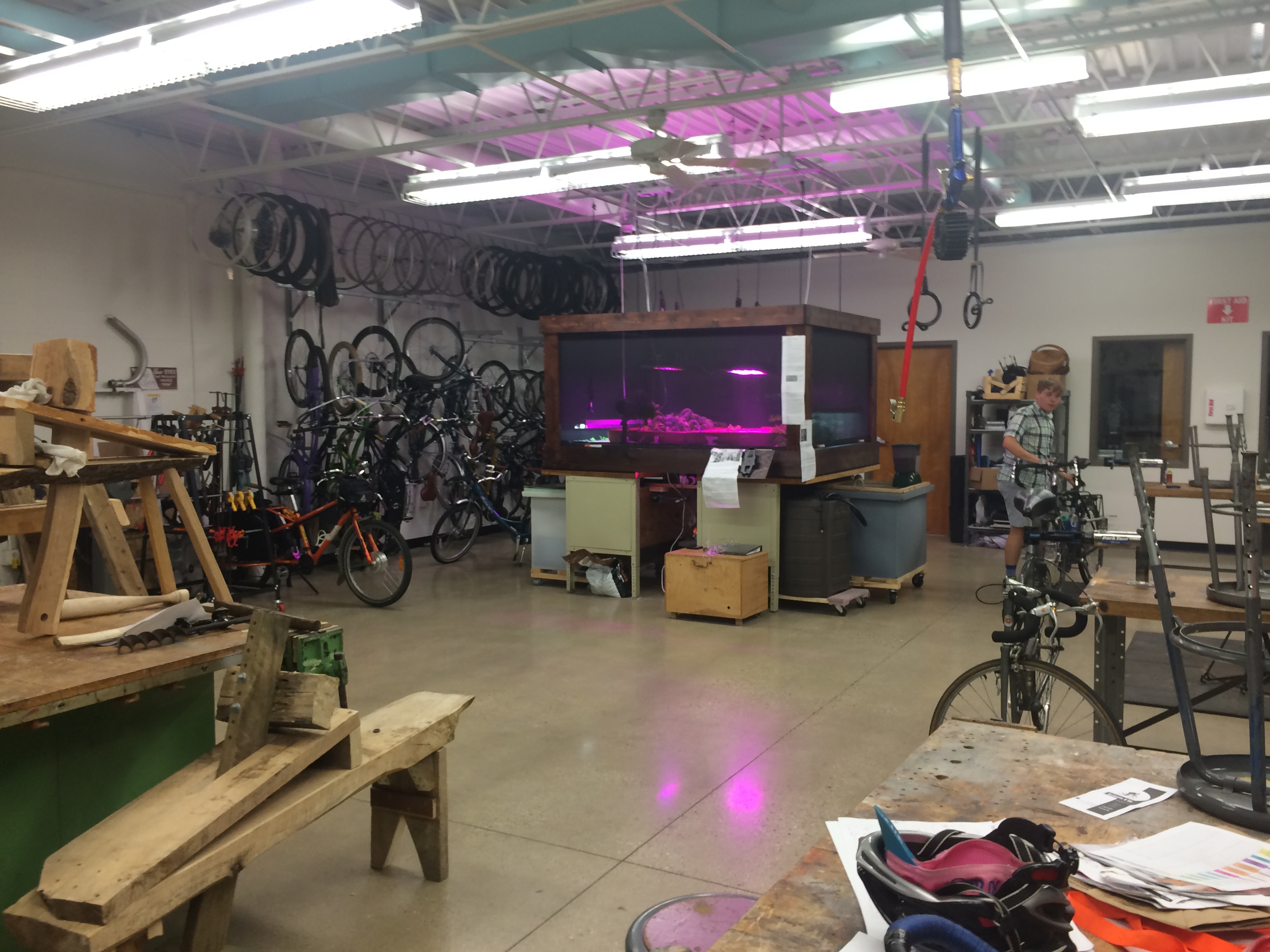 The WMU Center for Sustainability is supported by an $8 per student fee that students voted to tack onto their fees. The Center includes a green jobs fund that provides employment for 40 students and operates Gibbs House, an off-campus cooperative residence where six to eight students focus on conscious living and developing sustainability projects in hydroponics, permaculture and other topics. David runs the ‘fix-it’ room where students do wood projects and bike repairs as well as the Bike Stable that collects, repairs, and distributes bikes.