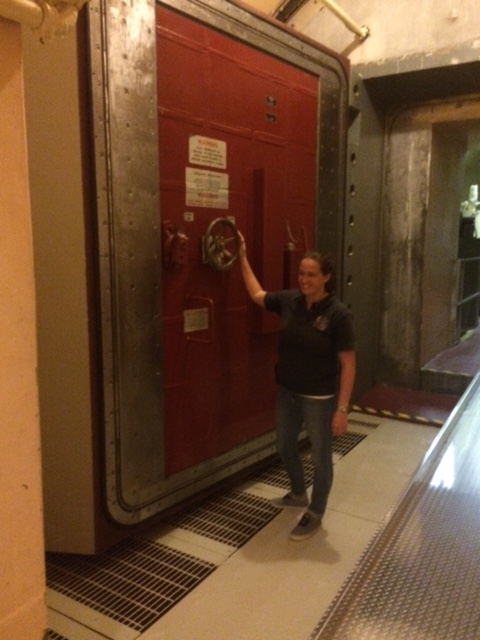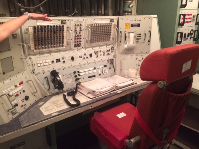 A security door near the living quarters leads to 9000-pound capacity freight elevator. Guinn took me fifty feet down. “They excavated an area the size of a football field, 60 feet deep, to build the underground portion of each alert facility.” At the base are two egg-shaped concrete containers. The elevator shaft is not blast-proof. Huge steel doors that make bank vaults look skimpy flank the elevator. A fourteen-ton equipment door leads to Launch Controls Equipment (LCE), a room full of mechanical devices that Guinn describes as the heart of the operation. A smaller human door, just as thick, leads to the Launch Controls Center (LCC), where the two officers resided during their shift. Guinn calls LCC the brain. I’m struck by the Cold War logic that humans are the brain while machines the heart. These days, we would probably reverse those designations.