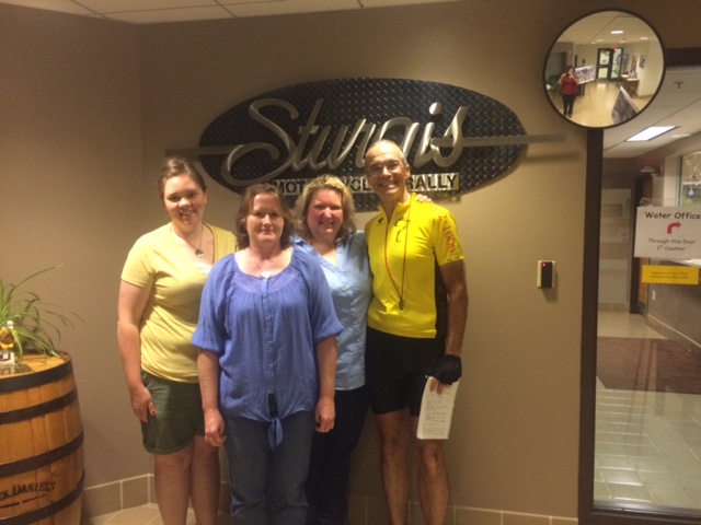 Tammy is a natural party planner. Before I leave she stuffs my panniers with Sturgis goodies, gathers me with her staff for a group photo, gives me a warm hug and wishes me Godspeed. She wants me to come back in September for the Grand Fondo, Sturgis’ road bike rally through the Black Hills. I wish I could loop back for that.