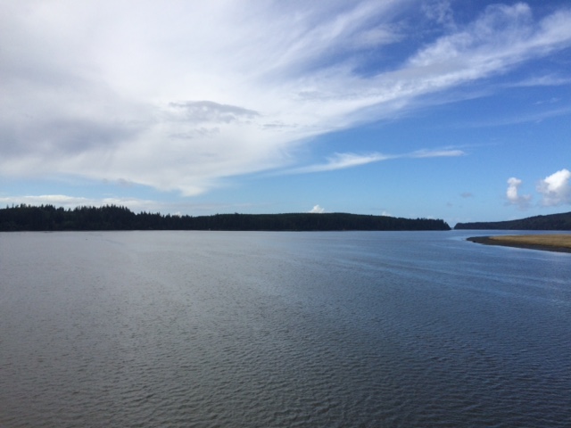 Forty miles on the Highway 101 cyclists adore. The road was good, the terrain gentle, the views amazing. Sometimes I hugged the shore. Other times the water was distant. There were fewer trucks past Raymond. In fact, there wasn’t anything except trees and more trees. I startled a huge buck in the woods. A mile later a parade of six large deer crossed the road. I saw more deer than houses.