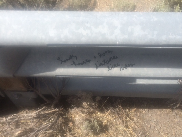 Although my legs keep moving to propel me forward, the journeys in my mind often cover greater range. I couldn’t decide who was the greater challenge in our world: the man who whisked by without notice or the one who couldn’t possibly cope. I mulled that one over, then solved the world’s problems and discovered eternal love at least three times before lunch. My musings lent meaning to the message tucked into the guardrail that I leaned my bike against for lunch: