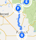 I traveled from mountains to foothills to rugged chaparral; one of the most beautiful rides of my trip. I had a good lunch break at the Raymond General Store, and then continued through ever-gentler hills, ever less vegetation. Twenty-five miles outside of Fresno I joined Highway 41, and was glad I didn’t take that busy road the entire route.