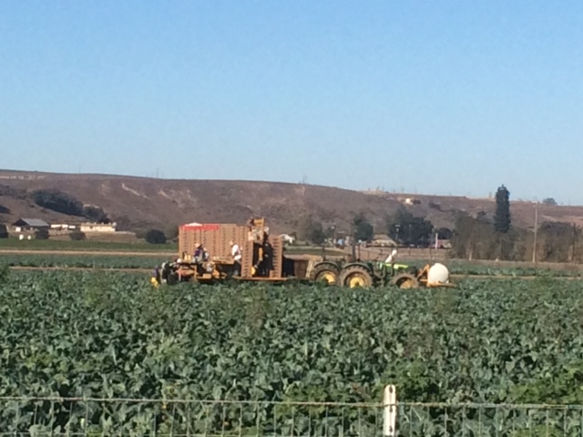 Faxon Canyon Road follows a valley rather than a traditional canyon. The valley floor has all sorts of agriculture, with sculptural hills rising on either side. I was intrigued by yet another method of efficient harvesting; a twin tractor setup that that included picking and packing in one movable process. I could not figure out what the laborers were harvesting – maybe broccoli?