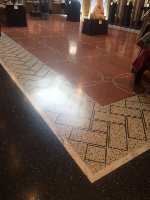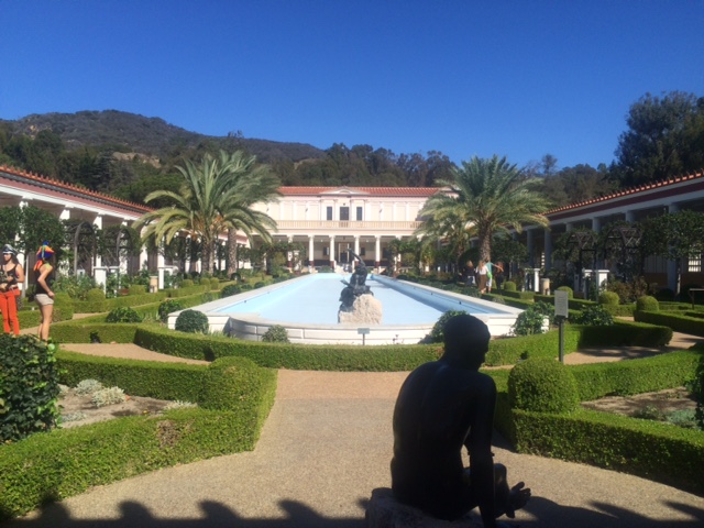 I wove through west LA to Venice Boulevard; six lanes (plus a bike path!) straight to the beach, then wound along the famous beach path through Santa Monica to the Getty Villa. Riding my bicycle dampens my interest in opulence, but the Getty Villa is pretty fabulous. The recreated Roman villa is stunning. Boston-based architect Machado and Silvetti’s extensive ancillary structures are also very good. The architectural tour guide made illustrative connections between opulent, status-conscience first century Rome and opulent, status-conscience twenty-first century California. I am not a connoisseur of early art, so didn’t spend too much time amidst the marbles, bronzes, and ceramics. But, the vistas are breathtaking, the proportions satisfying, and the terrazzo and tile floors are the most spectacular I’ve ever seen.