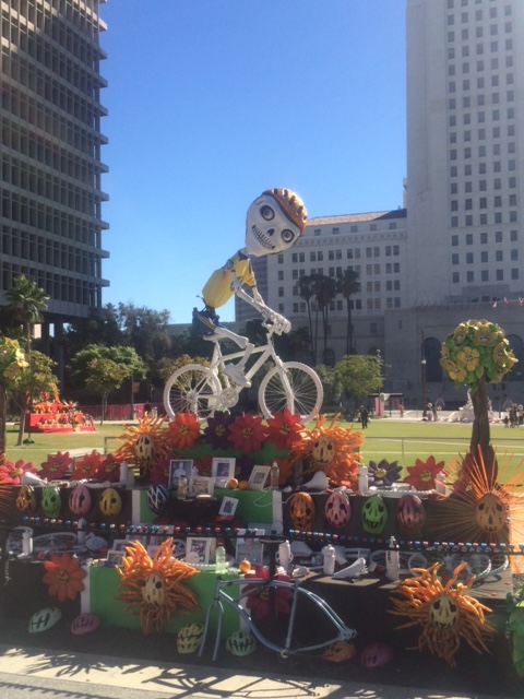 Two events bookended my downtown LA experience. In the morning I stopped at Pico-Union, a hard-surfaced space where young street artists develop their talent without running afoul of the law. In the late afternoon I cycled through the Hancock Park neighborhood where young trick-or-treaters went door to door. Since it was Saturday in this heavily Jewish neighborhood, there were also dozens of men in black suits with flat brimmed hats walking to synagogue. And I was riding along in garish yellow. I marveled at the cacophony of our costumes: the four-year-old spider man, the bearded gentleman, and the spandex cyclist.