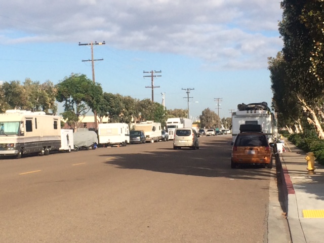 South of the base, the bike path continues through a light industrial maritime area. The road is lined with mini-vans, old trailers, and recycled motor homes. I saw many fewer street people in San Diego than in any other West Coast cities, but there’s an entire community of people struggling to hang on by living along these roads.