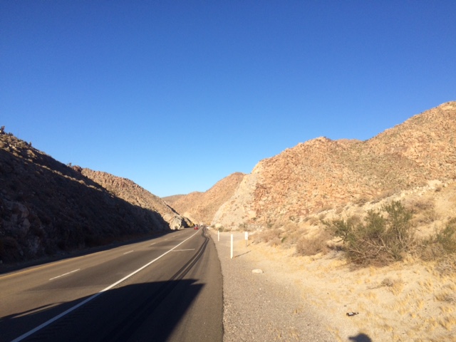 In between, I made the physical and psychic shift from coast to inland, a shift aided by favorable tailwinds and the excitement of turning the second corner of my journey. I’m heading east! The ride was a series of big climbs, over 6,600 vertical feet, with small dips until the end, when I had to join Interstate 8 for a harrowing eight-mile descent. As I moved east, the close-cropped hills began sprouting boulders. Then the mix of soil and rock equalized. By the time I reached the western edge of the Imperial Valley, the mountains were literally gigantic piles of rock.