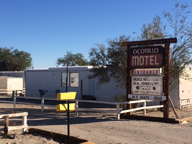 Bicycle touring is ripe with contrast. I rose with the sun and breakfasted on Greek yogurt with fresh blackberries and excellent coffee with my host Matthew. The sun shimmered off the Pacific Ocean and San Diego skyline when we rode away from his spacious hillside home. By sunset I was grinding the final kernels from a bag of microwave popcorn in my concrete block room at the Ocotillo Motel, the only guest in the four-room compound set in the middle of a dusty trailer park. The Red Feather general store was already closed for the day and it was too early to go to the Lazy Lizard Saloon.