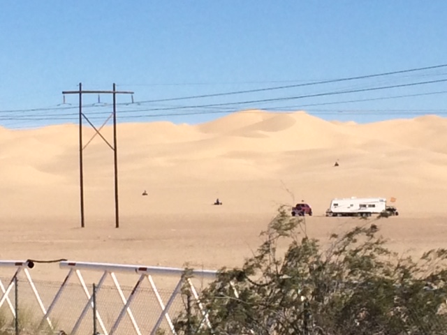 Despite lousy roads, everything else was great. I had a nice tail wind in the morning, and a manageable cross breeze when the wind picked up and shifted. I am enthralled by the surreal desert landscape. The kids riding buggies over the dunes looked like little bugs climbing about the massive sand hills. The channels from the Colorado River are such deep blue against the tawny land. There’s much more water here than the parts of California fed by the Sierras. All that rain I witnessed in Colorado got here before me.
