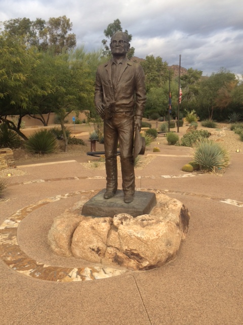 On the way to my second Scottsdale host, I stopped at the Barry Goldwater Memorial. Though he doesn’t merit a Presidential Library, the affluent citizens on this area have erected an elaborate memorial to their favorite son, which includes two marble paths with inlaid bronze letters. Problem is, the quote about the natural beauty of the West is banal, while the one about preserving our nation’s security is fearfully bellicose. Like all of us, Goldwater reflected his origins. In his case, individualism and emphasis on private property led to a logical preoccupation with security. I am glad to be rolling along with everything I need and little that anyone else wants.