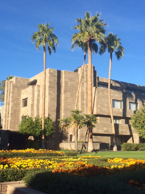 I wound my way to the Arizona Biltmore, the lavish 1920’s resort for which Frank Lloyd Wright was consulting architect. Everything about it is classy. The staff was very accommodating to a guy who clearly wasn’t registering for a room; the valet kept a personal eye on my bike. The Biltmore turned out to be one of my favorite Wright buildings, beautifully conceived and exquisitely executed. It may be the best example of his two dominant aesthetic ideas, as it was built toward the end of his Prairie / Usonian work and at the beginning of his larger scale, surface ornamented work.