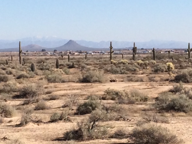Phoenix’s sprawl enveloped me for twenty miles and stopped along a sharp line when I reached Highway 87 and entered the Gila Indian Reservation. I took a break at the first wash I came upon to breathe in the desert and carb up. Then I pedaled twenty-five miles through stunning landscape to visit Casa Grande Ruins, our nations first archeological preservation monument. The remains of the four-story adobe structure and its surrounding plaza, circa 1350, represent the apex of an agrarian culture that existed for a thousand years, supported by an elaborate irrigation system fed by the Gila River. The society collapsed shortly after Casa Grande was built. The reasons are unknown, but there is evidence that increased population encountered a period of heavy flooding that washed out the canals, forcing the people to relocate and decentralize.