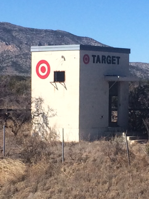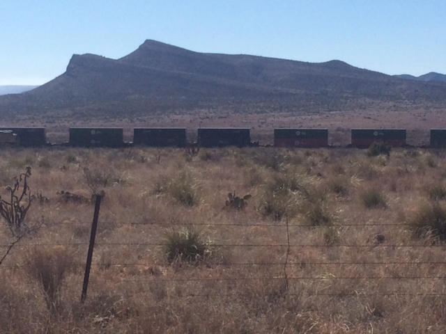U.S. 90 parallels a major railroad line, Half-mile long freight trains pass several times a day, an Amtrack Silverliner slithers by daily, and I hear train whistles all night long. Giant snakes of containers stacked on the flat beds; often bright blue, red, or green; move across the monotone landscape like cubes of modern art. Of course, due to the Marfa effect, there are also conscientious pieces of landscape art here, the most recent being the Target outside Marathon.