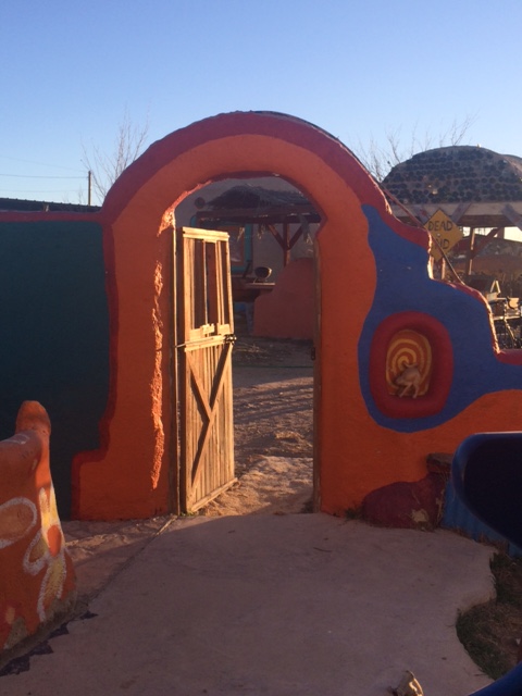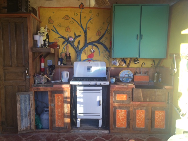 When the sun slung low I pedaled to the locally famous hostel, La Loma del Chivo, a remnant of hippie days that welcomes itinerant cyclists. Hostels are odd places; purposefully disorganized. La Loma has a wonderful, warm host, Ingrid, aka Goat Queen. The gestalt of the place probably changes every day. This night, a profoundly quiet German couple kept to the edges while Tom, an obese former lawyer fresh from a Wal-Mart grocery run who claimed to be a long-distance cyclist filled the silence. He was engaging until I distilled he’d been drifting within a hundred miles of here for nearly a year. We were a disparate group of guests. Nevertheless, I enjoyed strolling around the bizarre place, taking in the perfect sunset, followed by amazing stars. Since the longer-term guests had claimed the bunks, I slept on a comfy sofa beneath heavy quilts.