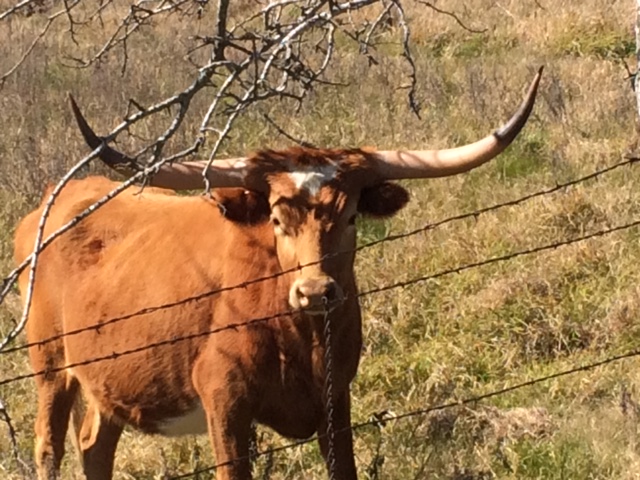 The day was fair, the countryside gentle and the wind benign. After too many miles on the shoulder of U.S. 290 I turned north on Country Line Road. I was supposed to connect to Texas 93, but when I reached that highway I simply couldn’t pass up the opportunity to meander more local roads. So I continued an unchartered route, using wind and shadow to guide my north and easterly direction. I passed rolling ranches, watering holes, longhorn cattle, sheep, and donkeys: twenty miles of the most pleasant cycling of my trip.