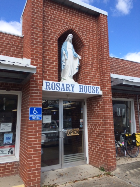 A highway sign, painted on the wall of an abandoned warehouse in New Iberia, advertised rosary manufacture. Since I love factory tours, I had to stop. Turns out, there is no factory; Rosary House assembles rosaries by hand. Half a dozen small desks with mirrors and a drawer of supplies are scattered around the store. The middle-aged women who wait on customers and stock the shelves bead rosaries between tasks. Ruth Herbert usually assembles two or three a day. “It depends on how busy we are with other things.”
