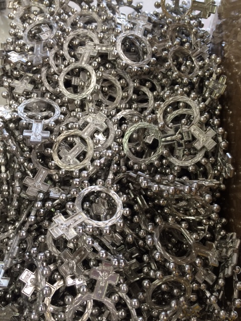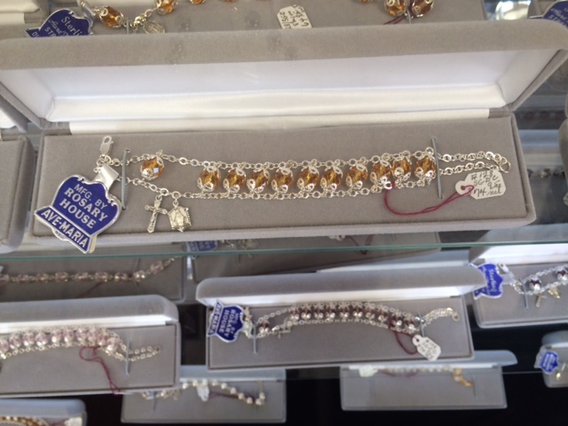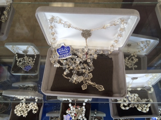 When the Rosary House store opened, during the 1960’s peak of Catholicism in the United States, it was about the size of an A&P grocery or Woolworth 5 & 10. Since then both A&P and Woolworth have gone bust. Meanwhile their successors, the Albertson’s and Wal-Mart’s of the world, sell food and sundries in structures larger than football fields. Rosary House holds steady, with plenty of space to display vestments, chalices, statues and Bibles as well as rosaries, cases and cases of rosaries. But don’t look for a Rosary House franchise to open in your town anytime soon. The market for handmade rosaries is a shrinking one, and this throwback retail/handicraft outlet can handle all of our devotional demand.