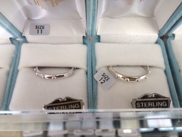 A handmade sterling sliver rosary in a jewelry case costs about $350. Rosary House also makes rosary bracelets (a set of ten beads that the faithful finger forward and back), and rosary rings that count prayers by twirling. In silver, these run from $30 to $50. For the budget minded, Rosary House offers manufactured rosaries and trinket rings, shipped from the other side of the world rather than assembled on site, for as little as 95 cents.