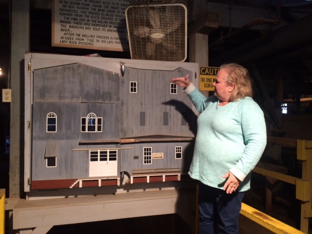 “Gravity is working for us all time.” Wendy unfolded the shadow box section of the mill that illustrates how raw rice is conveyed to the top floor and its bran is pearled off to become livestock feed. Pearled rice drops to the second floor to separate full grains from nubs. Nubs are used to make beer while full grains are polished for human consumption and conveyed to the first floor for packaging.