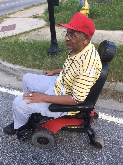 On my way to Hearth Table catfish buffet I came upon a confused elderly man in an electric wheelchair. He showed me his nametag: Sylvester Dawson, Richmond Summit House. I goggled his apartment, discovered it was more than a mile away, and asked him what he was doing out on such a hot day. “Getting lost.” So, I walked him sixteen blocks through Augusta’s eviscerated inner city. Many streets had no sidewalks, but his low-boy wheelchair navigated the blacktop better than concrete anyway. We made quite a pair. I let my bright shirt and sadd