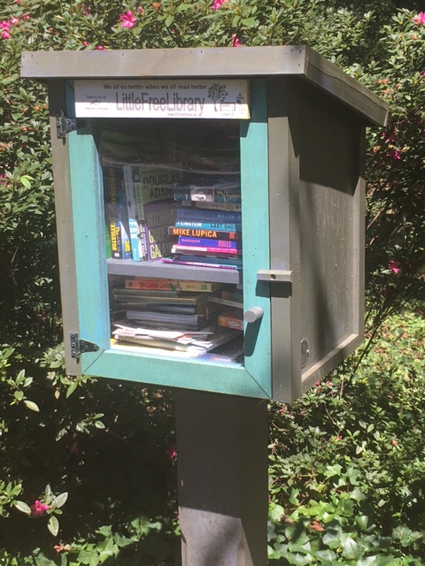 I headed out of town, which meant hills and more hills. I waited out a downpour on the narrow front porch of a model home in a new subdivision without triggering any security alarms. The Paces, a neighborhood of well-heeled estates, has many beautiful homes, and a few garish conceits as well. I was pleased to find a little library at one intersection, since I recently finished my paperback. I traded it out for Hitchhiker’s Guide to the Galaxy, which seems more appropriate to my way of living then anyone who lives there.