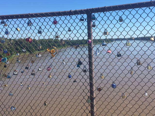 I don’t know why there are bike locks all over the chain link fence that protects cyclists from a better view of the Missouri River, but the vehicle structure that dwarfs the bicycle span is impressive. I felt the circles of my trip lap back on each other when I crossed the Missouri River near its mouth at St. Charles after tracing it for weeks last summer through the Dakotas and Montana.