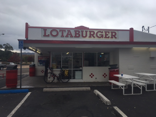After so much culture, I indulged in a late lunch at Lotsaburger, a local fast food franchise that lives up to its hype. Full of high art and low food, I rode seventeen miles in the rain to stay with a host who lives in an Airstream. Fortunately for me, the rain stopped just in time to witness my own tri-partie horizontally banded landscape, albeit in the grey tones of the day.