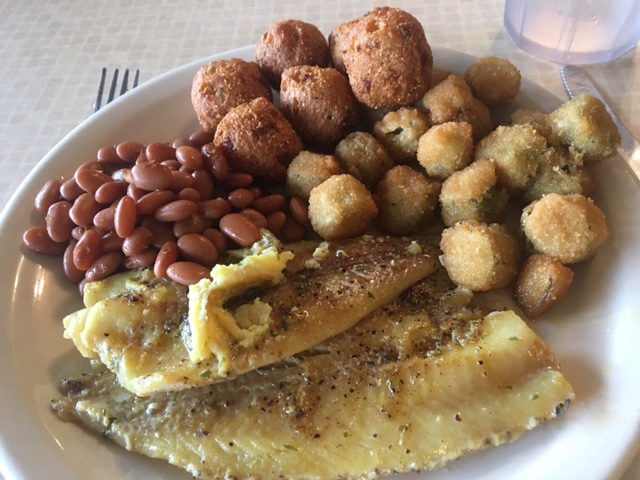 img_7866Today I cycled through a swath of that territory, from Muleshoe through Littlefield to Levelland, under a grey dome that didn’t turn sunny until mid afternoon. I look for buffet lunches on long travel days; the Dinner Bell’s Friday catfish buffet hit the spot. Fried okra, fried fish, fried popcorn shrimp… do you spot a trend? Seems I was the only patron who ate the sautéed fish. Then again, I was the only one lacking a big belly and a bigger hat.