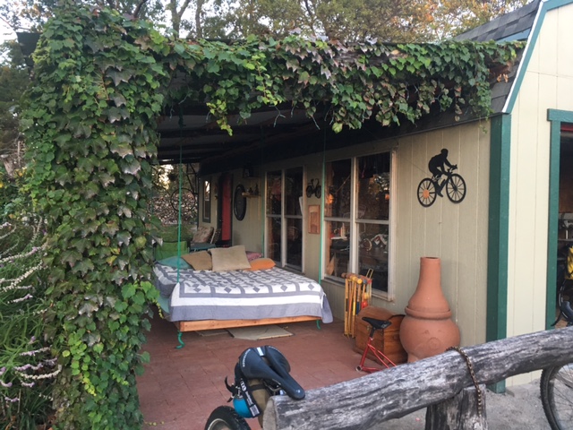 There’s nothing complacent about Keith Reed. After completing two long tours: the first across North America from Acadia, ME to Portland OR via Canada with two nieces in their twenties; the second through the Alps with his two sons; Keith decided to create the perfect warmshowers experience at his home. He began with a portable barn shed with a roll-up door, futon and wood stove, added a lean-to kitchen with bath, then a front porch across the length with a suspended bed for sleeping outdoors, and fire pit for warm conversations deep into the night.
